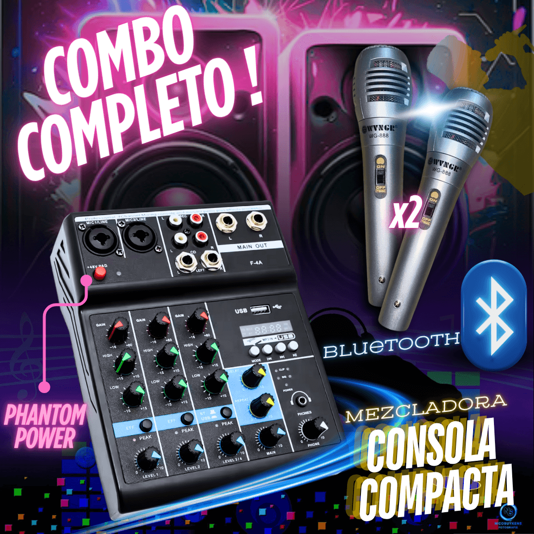 Consola de Sonido Profesional 4Canales con Bluetooth + 2 Micrófonos